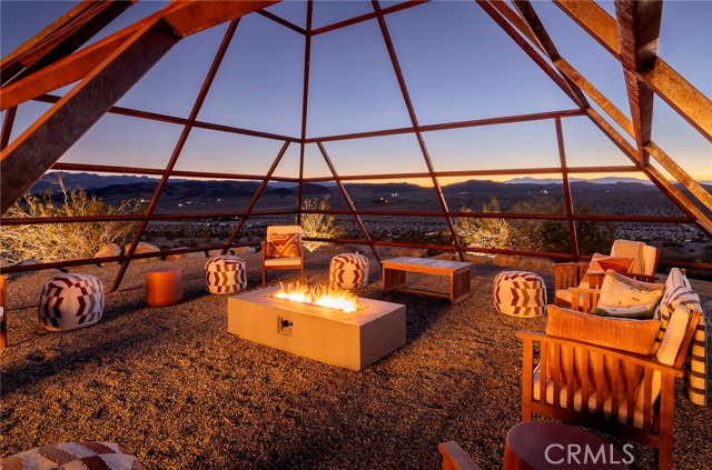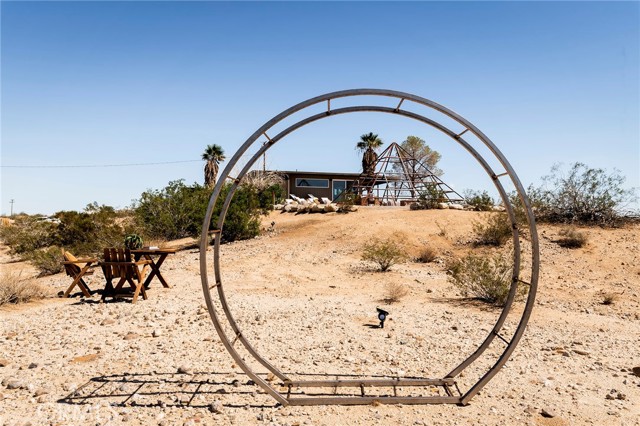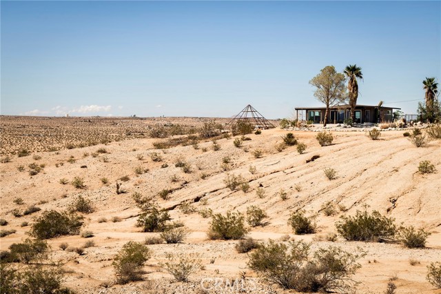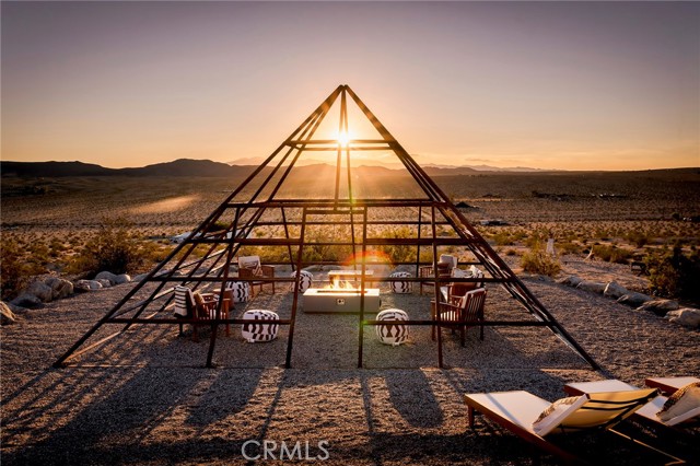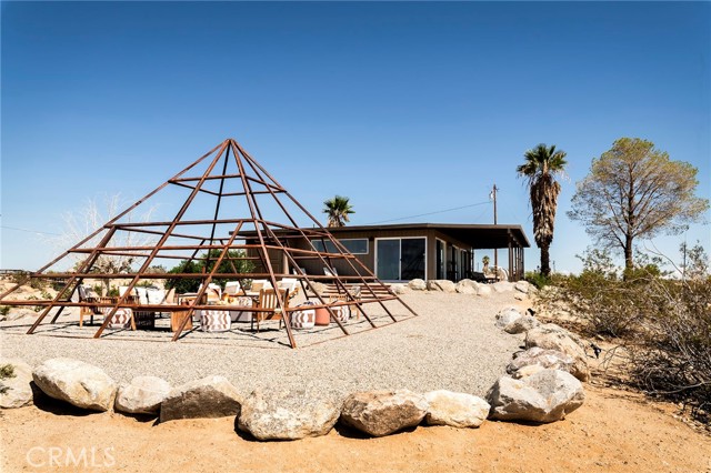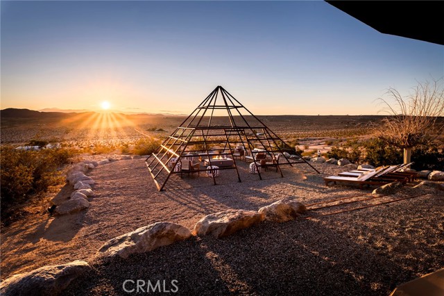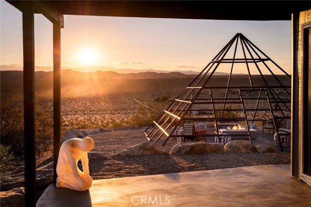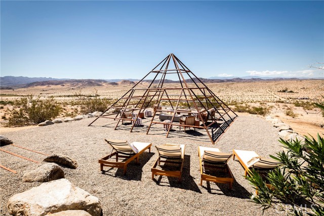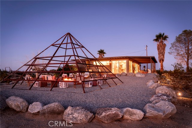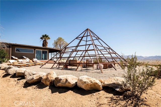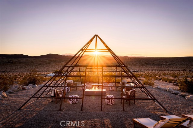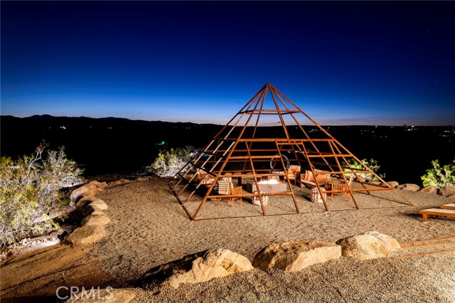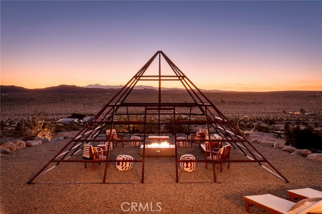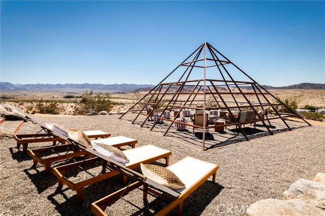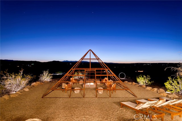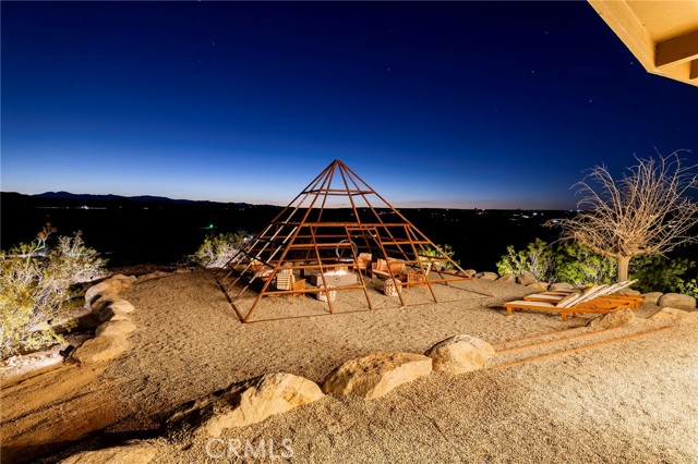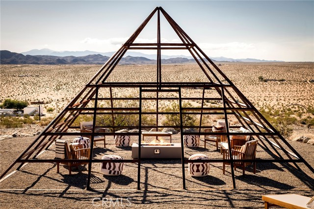 29 WEST PYRAMID HOUSE: Perched on the top of its own mountain, this striking 2-bedroom, 2-bathroom retreat delivers 360-degree views spanning Indian Cove in Joshua Tree National Park, Big Bear, and San Gregorio. Framed by dramatic imported boulders and pristine desert landscape, the property offers a rare blend of privacy, serenity, and natural beauty. At night, the dark skies transform into a stargazer’s dream, making this a true High Desert sanctuary. The centerpiece of the landscape is a bold steel-frame pyramid, measuring 24' x 24' x 14', positioned at the mountain’s edge. This dramatic outdoor structure creates a visual anchor and an unforgettable backdrop for both day and night desert living. Inside, the home is curated with Venetian plaster walls, lime wash finishes, and custom vertical plaster striping. The open floor plan is framed by expansive sliding glass doors and an 8-foot picture window, pulling the desert scenery directly into the living space. Spa-inspired bathrooms feature floating vanities, backlit mirrors, wood tile, and marble finishes, blending sophistication with soothing desert textures. A shaded porch extends from the living room, offering a peaceful vantage point for sunrise coffee or evenings under the stars. Custom channel lighting in the living room mirrors the sharp lines of the pyramid, emphasizing the interplay of geometry and desert landscape. The large kitchen showcases brand-new wood counters, custom cabinetry, and generous storage — designed for both everyday use and stylish entertaining. Centrally located at the edge of 29 Palms and Joshua Tree, this property is just minutes from both villages, with easy access to shops, restaurants, and Joshua Tree National Park. Blending bold design, natural elements, and complete privacy, this mountain-top retreat embodies modern desert living at its finest — the kind of home you’d expect to see in the pages of Architectural Digest.