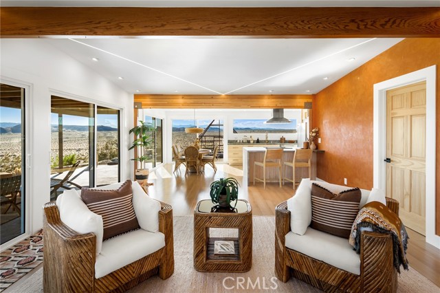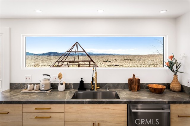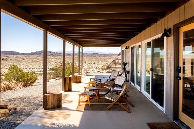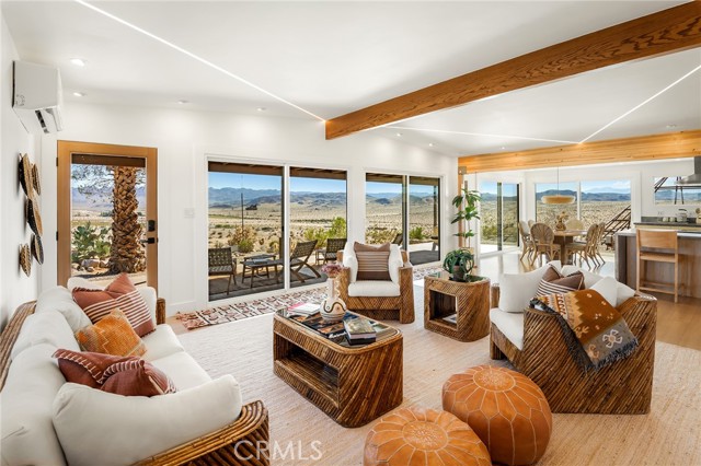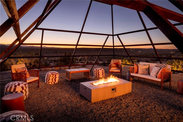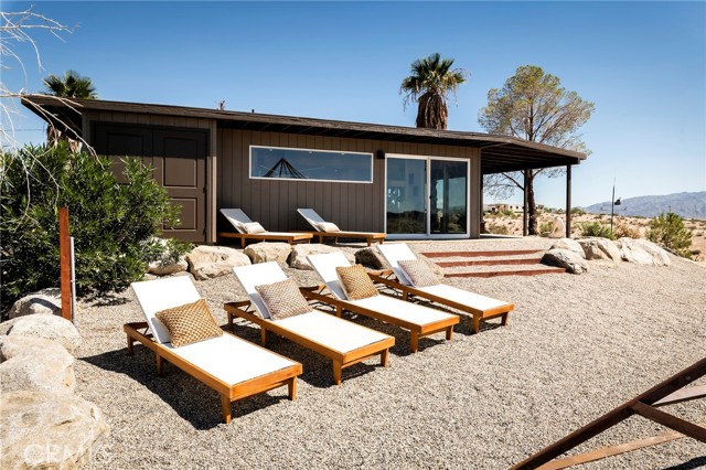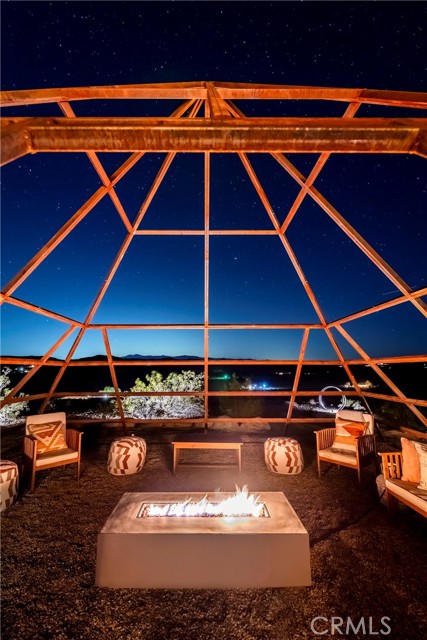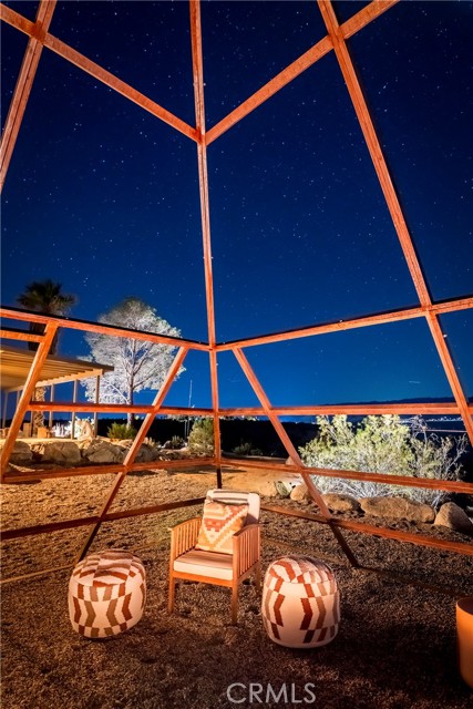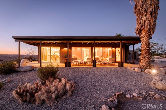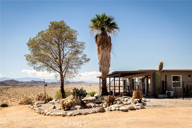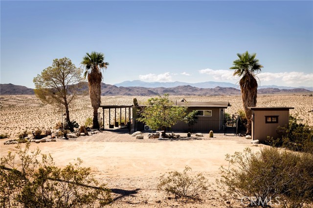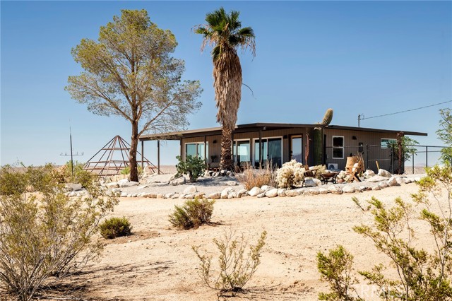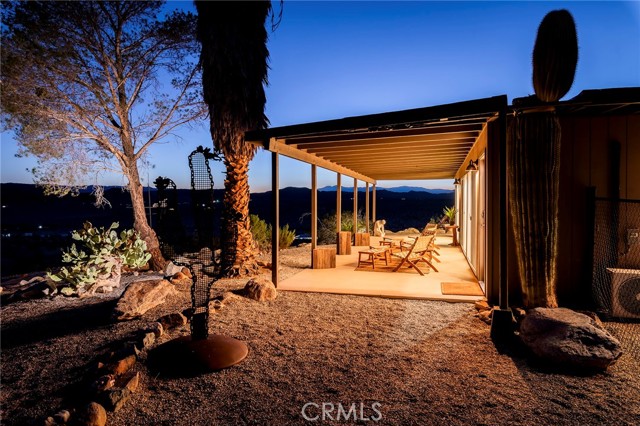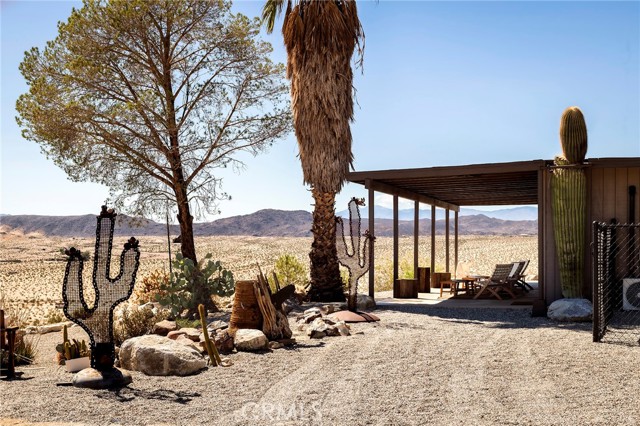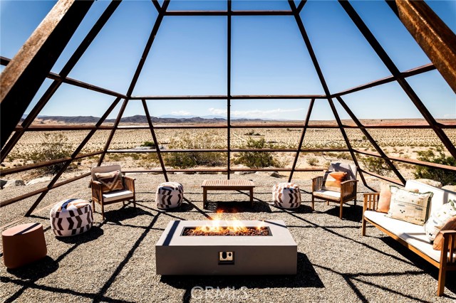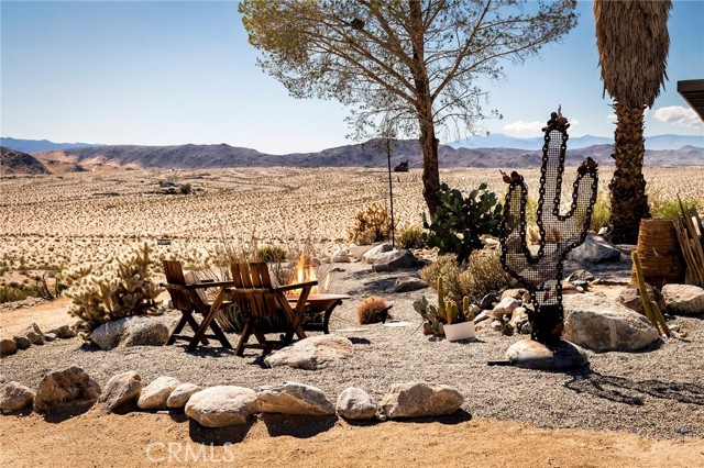 29 WEST PYRAMID HOUSE: Perched on the top of its own mountain, this striking 2-bedroom, 2-bathroom retreat delivers 360-degree views spanning Indian Cove in Joshua Tree National Park, Big Bear, and San Gregorio. Framed by dramatic imported boulders and pristine desert landscape, the property offers a rare blend of privacy, serenity, and natural beauty. At night, the dark skies transform into a stargazer’s dream, making this a true High Desert sanctuary. The centerpiece of the landscape is a bold steel-frame pyramid, measuring 24' x 24' x 14', positioned at the mountain’s edge. This dramatic outdoor structure creates a visual anchor and an unforgettable backdrop for both day and night desert living. Inside, the home is curated with Venetian plaster walls, lime wash finishes, and custom vertical plaster striping. The open floor plan is framed by expansive sliding glass doors and an 8-foot picture window, pulling the desert scenery directly into the living space. Spa-inspired bathrooms feature floating vanities, backlit mirrors, wood tile, and marble finishes, blending sophistication with soothing desert textures. A shaded porch extends from the living room, offering a peaceful vantage point for sunrise coffee or evenings under the stars. Custom channel lighting in the living room mirrors the sharp lines of the pyramid, emphasizing the interplay of geometry and desert landscape. The large kitchen showcases brand-new wood counters, custom cabinetry, and generous storage — designed for both everyday use and stylish entertaining. Centrally located at the edge of 29 Palms and Joshua Tree, this property is just minutes from both villages, with easy access to shops, restaurants, and Joshua Tree National Park. Blending bold design, natural elements, and complete privacy, this mountain-top retreat embodies modern desert living at its finest — the kind of home you’d expect to see in the pages of Architectural Digest.