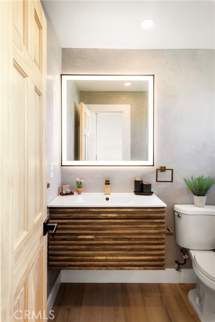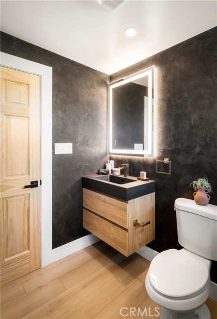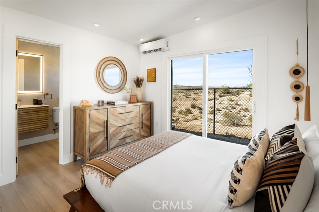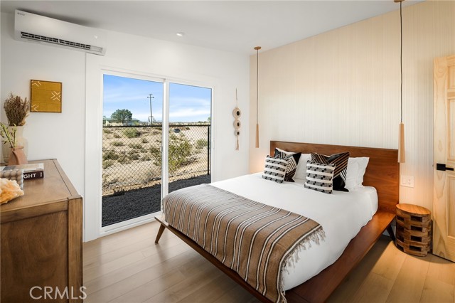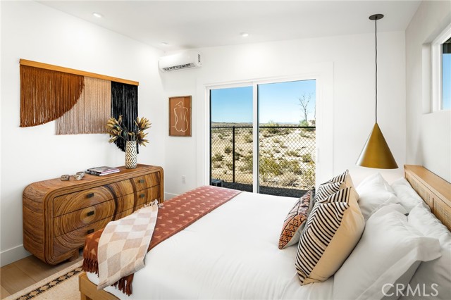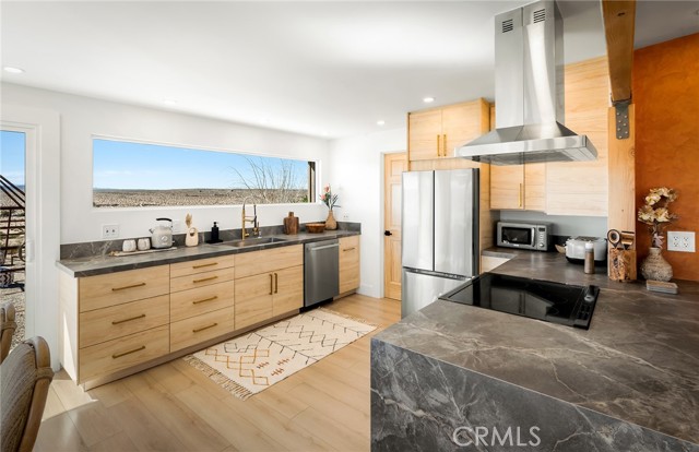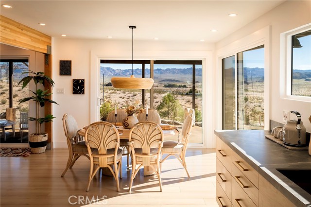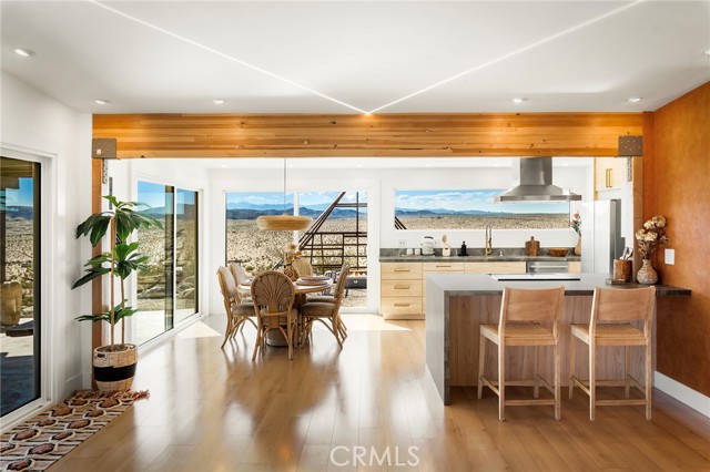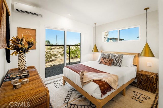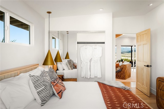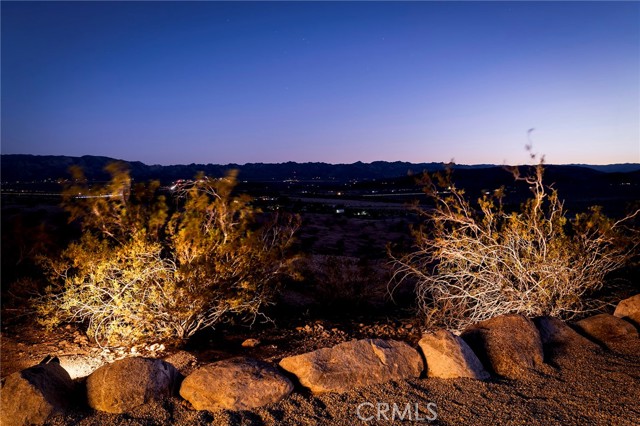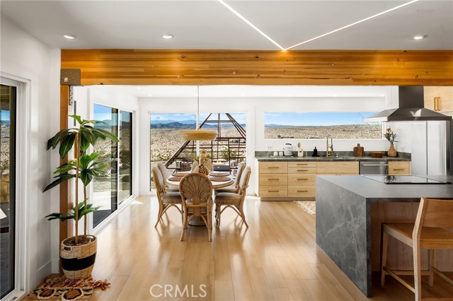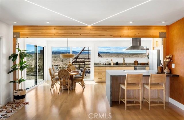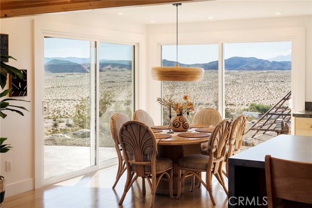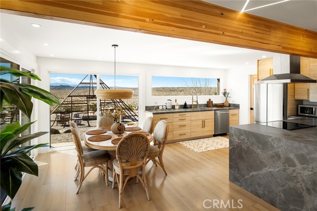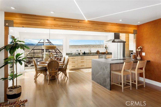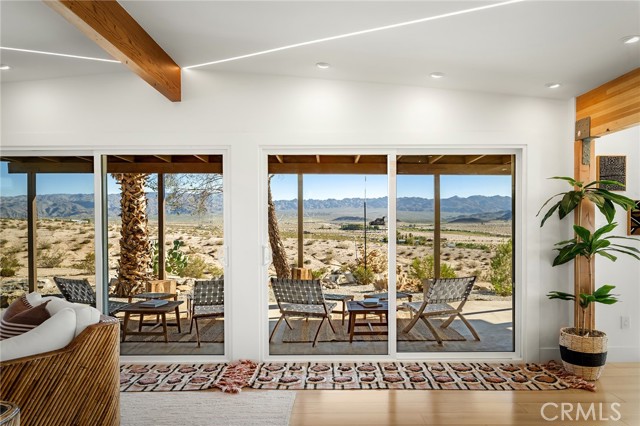 29 WEST PYRAMID HOUSE: Perched on the top of its own mountain, this striking 2-bedroom, 2-bathroom retreat delivers 360-degree views spanning Indian Cove in Joshua Tree National Park, Big Bear, and San Gregorio. Framed by dramatic imported boulders and pristine desert landscape, the property offers a rare blend of privacy, serenity, and natural beauty. At night, the dark skies transform into a stargazer’s dream, making this a true High Desert sanctuary. The centerpiece of the landscape is a bold steel-frame pyramid, measuring 24' x 24' x 14', positioned at the mountain’s edge. This dramatic outdoor structure creates a visual anchor and an unforgettable backdrop for both day and night desert living. Inside, the home is curated with Venetian plaster walls, lime wash finishes, and custom vertical plaster striping. The open floor plan is framed by expansive sliding glass doors and an 8-foot picture window, pulling the desert scenery directly into the living space. Spa-inspired bathrooms feature floating vanities, backlit mirrors, wood tile, and marble finishes, blending sophistication with soothing desert textures. A shaded porch extends from the living room, offering a peaceful vantage point for sunrise coffee or evenings under the stars. Custom channel lighting in the living room mirrors the sharp lines of the pyramid, emphasizing the interplay of geometry and desert landscape. The large kitchen showcases brand-new wood counters, custom cabinetry, and generous storage — designed for both everyday use and stylish entertaining. Centrally located at the edge of 29 Palms and Joshua Tree, this property is just minutes from both villages, with easy access to shops, restaurants, and Joshua Tree National Park. Blending bold design, natural elements, and complete privacy, this mountain-top retreat embodies modern desert living at its finest — the kind of home you’d expect to see in the pages of Architectural Digest.