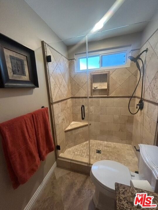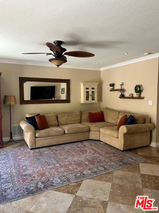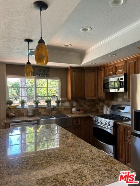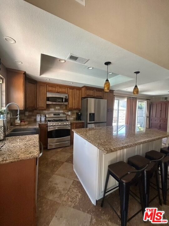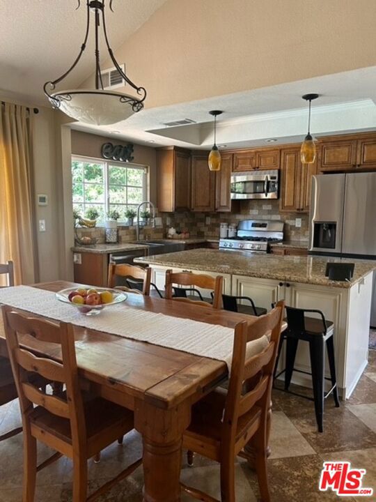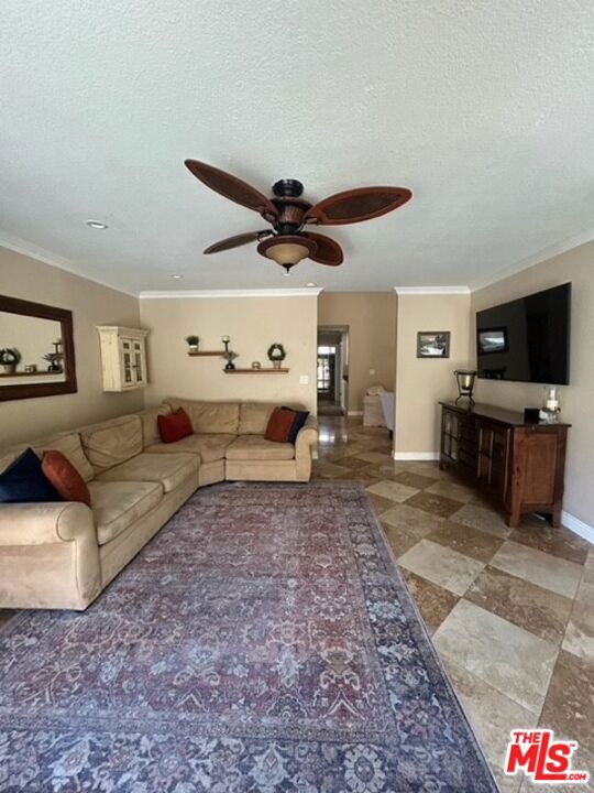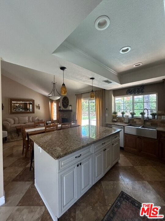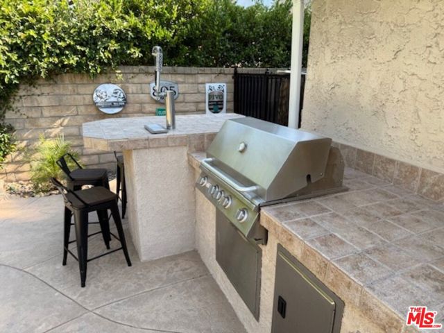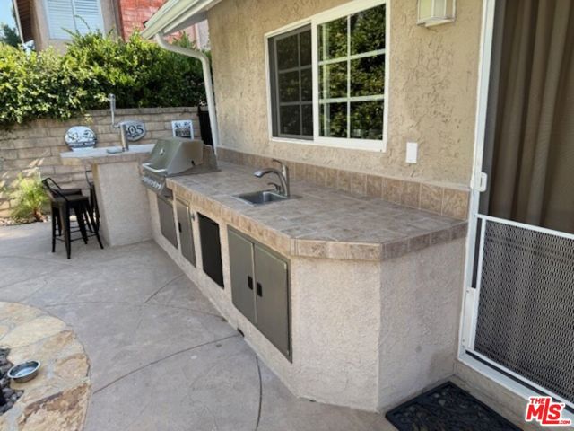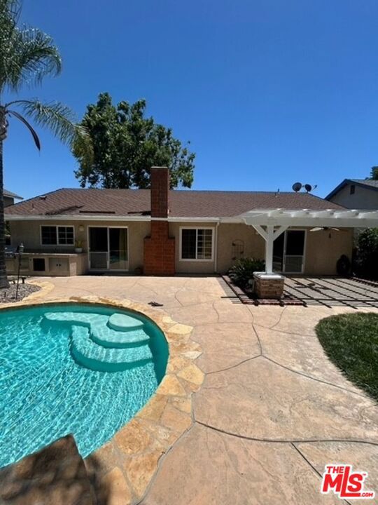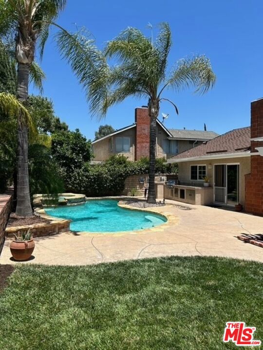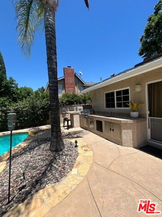 Discover your private retreat in the highly sought-after Valencia Meadows area! This beautifully renovated single-story home offers the perfect blend of classic charm and modern luxury, all within a block of the esteemed California Distinguished Meadows Elementary School and Valencia Meadows Park. Step inside and be greeted by an inviting open-concept layout, enhanced by elegant Tuscan travertine floors, crown molding, recessed lighting, and ceiling fans. The heart of this home is its renovated kitchen, featuring an island with bar seating, granite countertops, a large farm-style sink, stainless steel appliances, and convenient pull-out storage shelving. Enjoy effortless living with automated lighting throughout the house, controllable by voice command. The spacious primary suite boasts a luxuriously renovated bathroom with a sleek, glass-enclosed shower. The guest bathroom mirrors this sophistication, offering a stylish shower with chic finishes. Outside, your palm tree-lined backyard transforms into a private island escape, ideal for entertaining. It features a custom saltwater pool and spa, a well-maintained grassy area, and multiple inviting seating zones. The front yard showcases drought-tolerant landscaping complemented by a manicured lawn and beautiful rose bushes, alongside a convenient 2-car driveway. Located with easy access to the 5 Freeway, this home is just moments away from local restaurants, grocery stores, and recreational opportunities. Enjoy direct access to the famous Santa Clarita paseos, perfect for running, walking, scooters, and bikes. This exceptional home offers comfort, privacy, and an unparalleled Valencia lifestyle! Upgraded 200 amp square D electrical panel and all new breakers and additional 220 receptacle added for expansion or additional EV charger. Upgraded Goodman 4 ton 16 seer AC condenser, FAU, and coils. Honeywell 4 inch Hepa filtration system box & filter, additional screened 2 filter air purification filter system. New AP Smith signature 100, 50 gallon water heater tray. Intermatic panel guard, whole house surge protector. Shiplap decorative wall treatment in master and other bedroom. Renovated wood burning fireplace, gas assisted. Crown molding and 5" base molding throughout. Upgraded deco wall outlets throughout. Upgraded WiFi deco dimmer switches (for voice automation via google home or Alexa) throughout. Ceiling fans in den and all bedroom. LED recessed can lights throughout. Two speed whole house fan. 40-90 MP wall-box Charger. Upgraded copper re-pipe throughout. Upgraded type K water main. Replaced upgraded water pressure valve. Kevo automated security front door lock system. Blink smart WiFi video doorbell. Kube advanced water filtration system, Monotonics Eos home security system. Intell touch automated pool/spa control system 7+. Low voltage yard lights in the back yard, palm trees. Upgraded plantar digital variable speed pool motor. Hayward pool salt coloration generation system. 22 foot long BBQ stainless Bull Brama 5 burner BBQ, beer kegerator, mini fridge, bar sink, stainless storage cabinet with drawers, electrical outlets and raised seating for 4.