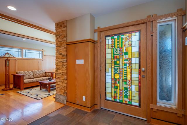 Architecturally striking and rich with character, 251 Palomares is a rare prairie-style residence that blends timeless design with modern comfort. It was built new to reflect the era. Tall, wide and straight is evident throughout including the work of a master carpenter.Strong horizontal rooflines, stacked stonework, and custom lighting create a dramatic first impression, while stained-glass details and warm wood accents carry the artistry indoors.The entry opens to a thoughtful floor plan anchored by a stone fireplace framed with hand-crafted stained glass and elegant wood paneling throughout. Every detail has been carefully planned -- from the slate stone flooring to the custom light fixtures that add depth and warmth to each room.At the heart of the home, the chef's kitchen stands out with high-end appliances, abundant cabinetry, and generous prep space designed for both everyday living and entertaining. Upstairs, the grand primary suite offers a private retreat with a south-facing balcony, perfect for enjoying natural light and Ventura breezes. On the main level, a separate suite currently set as a private office provides flexibility for remote work or guest accommodations.Step outside to a spacious backyard deck surrounded by low-maintenance landscaping and hardscaping, ideal for gatherings or quiet moments at home. With its northeast-facing frontage, the home captures soft morning light while staying cool in the afternoons.From the custom wrought iron accents to the intentional architectural flow, 251 Palomares is more than a home -- it's a statement of design, craftsmanship, and California coastal living.