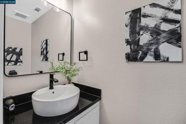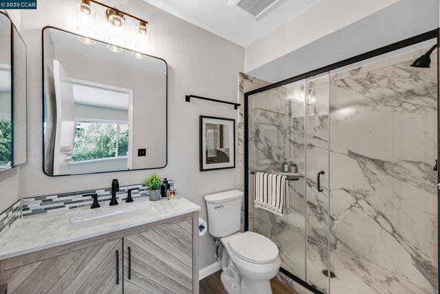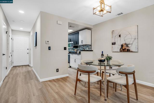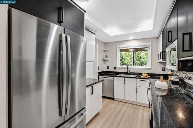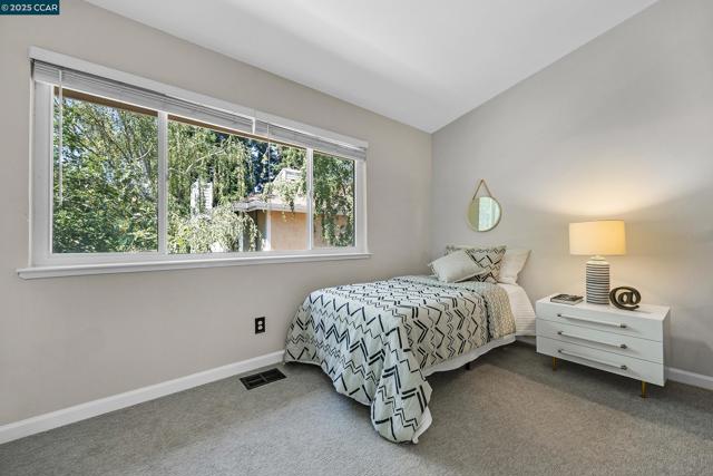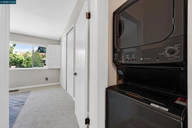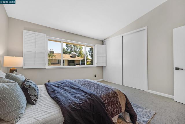 Upper-level townhouse in Carriage Place overlooking the swimming pool. Bright, spacious home with two primary bedroom suites upstairs. Two full baths: one with shower over tub, one with full shower. Stacked laundry. Skylights. Living room, dining room, kitchen, and ½ bath on the main level. Large deck and storage unit on deck. Townhouse has been completely remodeled: black-and-white kitchen with updated appliances and granite countertops. Granite countertop in ½ bath. Working fireplace with tile surround. Dual-pane windows and sliding glass door. Replaced HVAC and heating system. Upstairs baths are fully remodeled in black, white, and grey with updated vanities. Vinyl plank flooring throughout with carpet in bedrooms and staircase. Finished in white with black accents, lighting and door fixtures, plantation shutters and blinds. One assigned covered carport space and plenty of guest parking. Two pools in complex and well-maintained landscaping. Low HOA dues. Close to downtown Walnut Creek, Walden Park, Iron Horse Trail, BART, and freeway access.