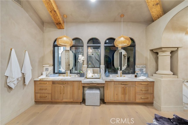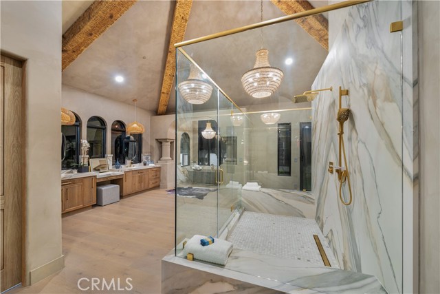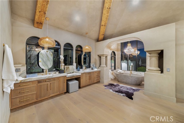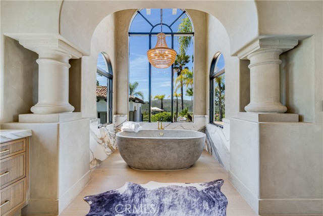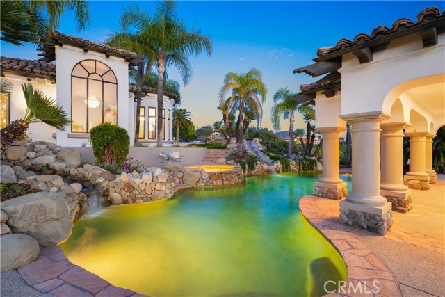 This breathtaking property is a true masterpiece of luxury and design! A gated Spanish contemporary compound in the exclusive North Ranch Country Club Estates, it combines traditional elegance with modern sophistication. Reimagined by designer Robb Friedman, the home offers unparalleled craftsmanship, panoramic mountain views, and lavish amenities. Key Features: • Interior Highlights: • Gourmet Kitchen: Custom cabinetry, dual Viking refrigerators, 66-inch Viking Tuscany range, two dishwashers, and a butler’s pantry. • Entertainment: State-of-the-art theater, game room, and dual powder rooms. • Luxurious Primary Suite: Includes a sitting room, cement fireplace, European white oak/glass walk-in closet, a spa-like bathroom with a cement soaking tub, custom shower, and a massage/yoga room. • High-End Finishes: Moroccan lime-wash accent walls, custom European wide-plank white oak flooring, and designer bathrooms. • Resort-Style Grounds: • Two pools: One with a waterfall and pool house, the other with waterslides and a grotto. • Multiple outdoor entertaining spaces: Two BBQ areas, a gazebo, and sprawling lawns. • Scenic exploration: Custom rock staircases spanning 3+ acres of grounds with jetliner views. • Additional Luxuries: • Elevator and dumbwaiter for convenience. • Detached guest house and pool house. • Oversized 4-car garage with storage. • Oversized Solar Power System. Every detail of this estate is meticulously curated for beauty and functionality, making it a rare gem in the luxury market.