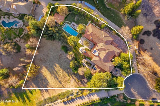 Set on a tranquil 1.5-acre cul-de-sac lot, this Italian Villa in Westlake Village stands as one of the most sought-after estates in the area. Designed for those who appreciate luxury living and entertaining, this European-inspired residence offers incredible mountain views and ultimate privacy, all within the exclusive Country Club Estates community. With approximately 11,000 square feet of living space, the home seamlessly blends classic elegance with modern comforts.The grand formal living room welcomes you with soaring ceilings and ample natural light, while a cozy library offers a quiet retreat. The expansive gourmet kitchen, ideally located next to the family room, is a chef's dream. It features a distressed wood-beamed coffered ceiling, custom copper accents, a full wet bar, and a wine cellar. A striking fireplace anchors the space, making it perfect for both casual family gatherings and formal entertaining. Adjacent to the kitchen, the formal dining room opens to a covered loggia, where you can enjoy a heated outdoor dining patio and a comfortable lounge area for year-round entertaining.On the main level, you'll find a private apartment suite that offers a separate living space, kitchen, and bedroom, all with direct access to the backyard. It's the ideal set-up for guests or multi-generational living, providing both comfort and privacy.Up the grand staircase, the master retreat awaits--spacious and serene, with a beautiful marble fireplace as its centerpiece. Two generous walk-in closets provide ample storage, and the luxurious en-suite bathrooms offer a spa-like experience, complete with a soaking tub and separate sauna. This level also features four additional well-sized secondary bedrooms, each with its own en-suite bathroom, ensuring plenty of space for family and guests.Designed with Southern California's indoor/outdoor lifestyle in mind, the estate's expansive grounds include a separate casita/pool house, complete with a fireplace, kitchenette, and full bath--perfect for poolside gatherings or as a guest retreat. Lush, manicured lawns surround the property, along with formal gardens that add beauty and privacy. The centerpiece of the backyard is a sparkling pool and spa, all set against a backdrop of breathtaking mountain views.This estate truly offers the best of California living, where every detail has been thoughtfully designed to provide both luxury and comfort. Whether enjoying intimate family time indoors or hosting large gatherings outdoors, this home offers the perfect setting for every occasion.