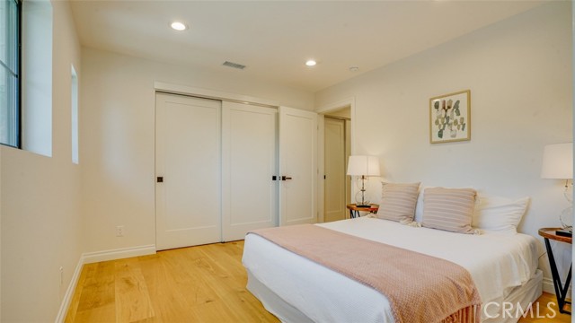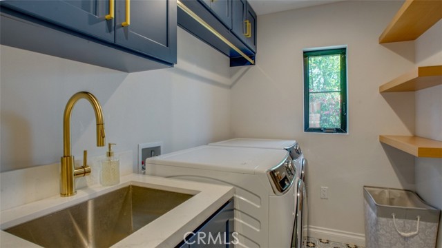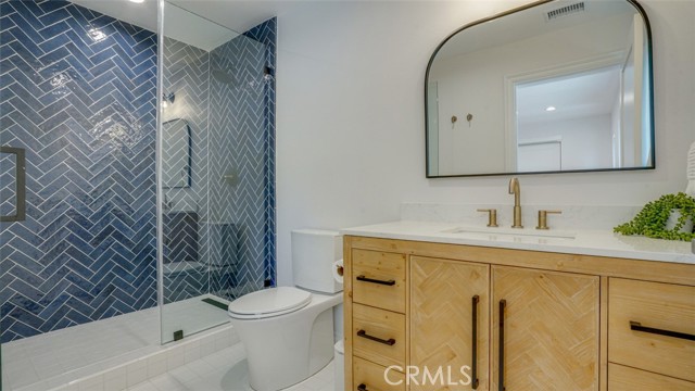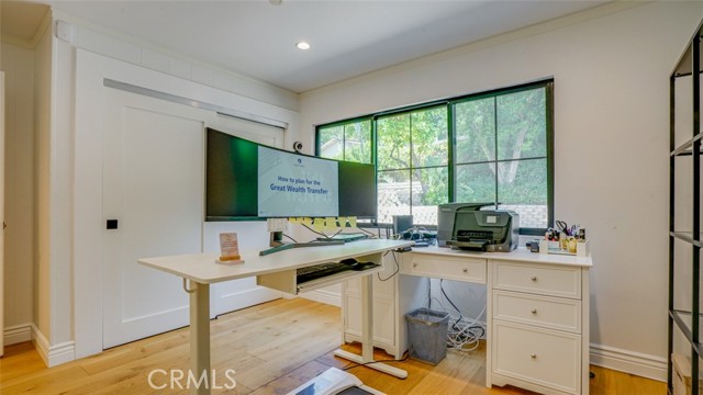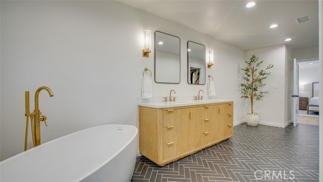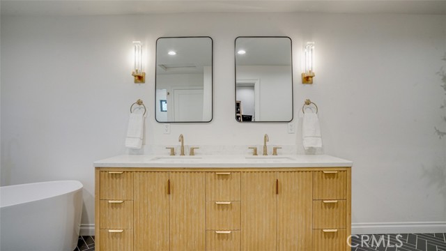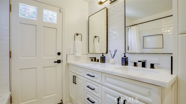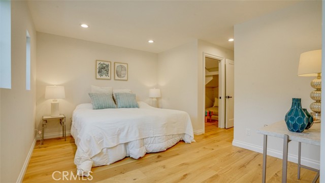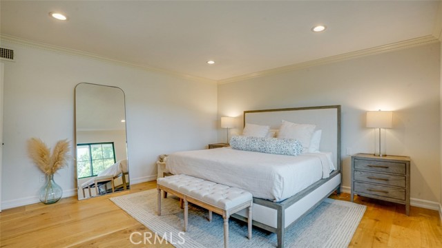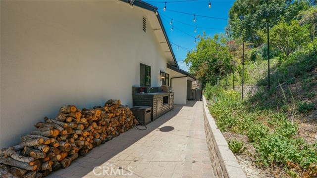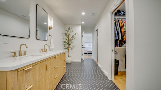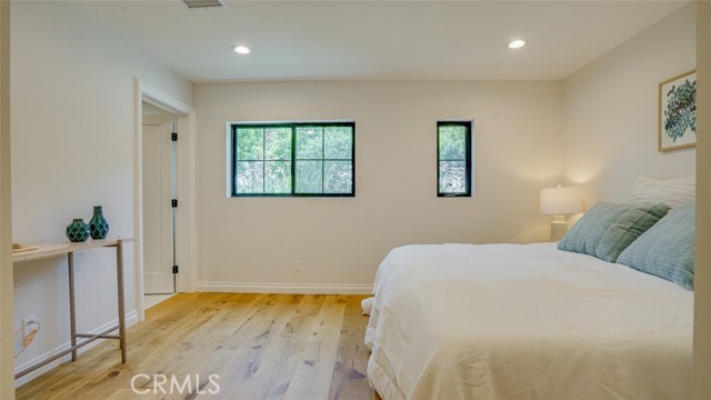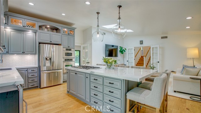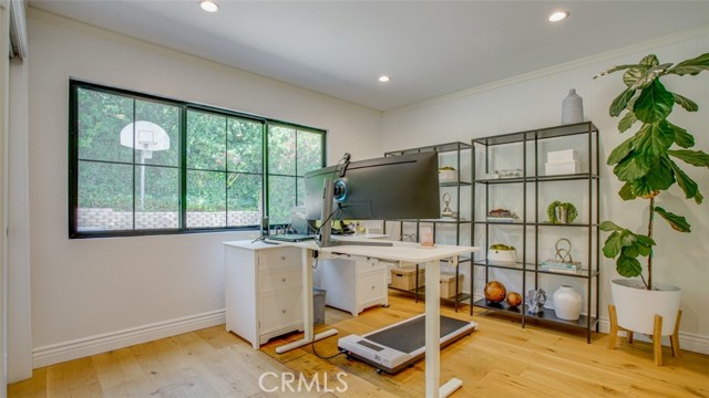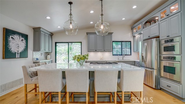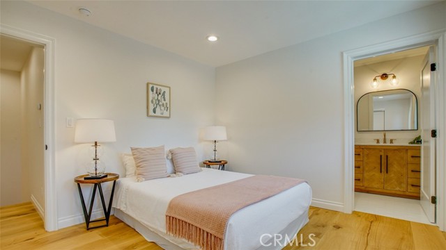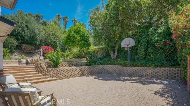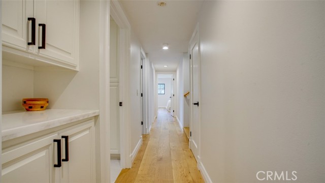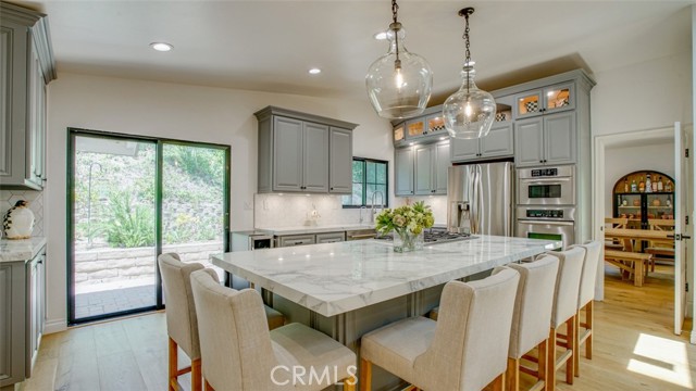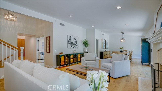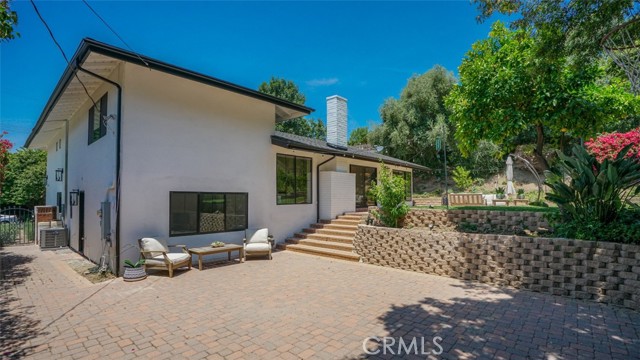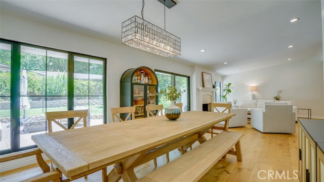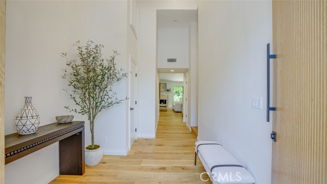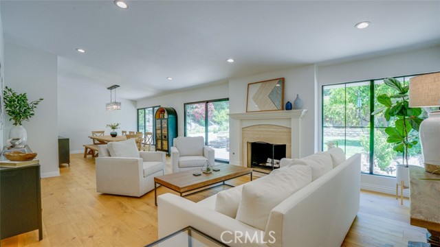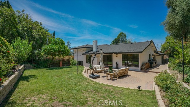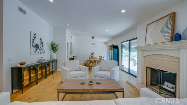 Sophisticated newly remodeled and expanded residence tucked into the hills of Woodland Hills. Positioned on a prime corner lot, this 5-bedroom, 5-bath home seamlessly blends clean modern design with a touch of coastal-inspired style. The attached addition and carefully selected upgrades elevate both function and beauty. Wide-plank white oak floors, all-new interior doors, a brand-new roof, new HVAC, and energy-efficient windows create a light-filled and elegant environment throughout. A dramatic 16-foot foyer entry sets the tone, leading into the open-concept living area centered around a sleek stone fireplace. Expansive windows and sliding glass doors flood the interiors with natural light while creating a seamless connection to the outdoors. The adjacent formal dining room—with its own oversized glass doors—opens directly to the landscaped backyard, perfect for entertaining or enjoying an indoor-outdoor lifestyle. The chef’s kitchen is a statement of both style and practicality, offering abundant custom cabinetry, generous counter space, a large island with seating for six, a five-burner cooktop, and double ovens. A sliding door from the kitchen opens to a built-in BBQ, ideal for al fresco dining. The primary suite serves as a luxurious private escape with dual walk-in closets and a spa-inspired bath featuring double vanities, a soaking tub, walk-in shower, and private water closet. Two additional guest suites each include their own full bathrooms with tile and granite finishes for comfort and privacy. On the lower level, two spacious bedrooms share a beautifully updated bath with double sinks, a tub/shower combo, and elegant finishes. A large laundry room is equipped with custom cabinetry, shelving, folding counter, and utility sink, plus two extra storage closets. The backyard is designed for both leisure and play, featuring a spacious patio, basketball court, and grassy area. Set in a highly desirable neighborhood with access to award-winning schools—Calabash Charter Academy, Hale Charter Academy, and El Camino Real Charter High School—this property offers the complete package: refined design, generous space, and a prime location. A rare turnkey opportunity in one of Woodland Hills’ most sought-after communities.