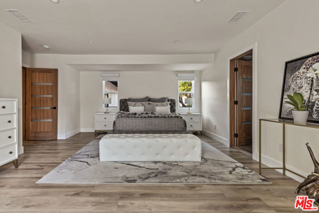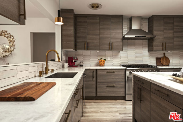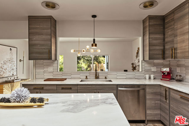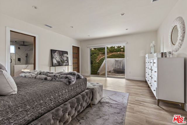 Come home to this striking mid-century modern, single-story Woodland Hills home with every high-end amenity desired, situated on more than a half-acre. The property is located on sought after Natoma Ave., where the street ends at the beginning of hiking trails. The home is elevated offering both privacy and stunning unobstructed views of the surrounding hillside, valley, and beyond. Enter through the double doors and be bathed in natural light thanks to the expansive windows and skylights. Discover the open concept living space that radiates harmony and sophistication. The chef's kitchen is thoughtfully designed and boasts high-end appliances, a spacious waterfall island that serves as both a culinary hub and a gathering point, and stylish finishes that make it as functional as it is beautiful. The living and dining rooms plus a custom-built wine bar is a perfect setting to host gatherings or intimate entertaining. The extra-large primary suite is a tranquil haven featuring a walk-in closet and a spa-like bathroom, offering a peaceful escape at the end of the day. The three secondary bedrooms are generously sized, set to be used as bedrooms, fitness center, or office, with each room filled with natural light and stunning views. The showstopper is the expansive backyard accentuating this striking mid-century modern paradise. Step into the resort-like private sanctuary, featuring a shimmering pool, four waterfalls, multiple lounging and gathering areas, multiple vistas, fire pit, bocce court, and beautifully landscaped yard, all combining to create an ideal setting for entertaining, recreation, and relaxation. Come home to the harmonious balance between indoor and outdoor living that provides the canvas for your lifestyle.