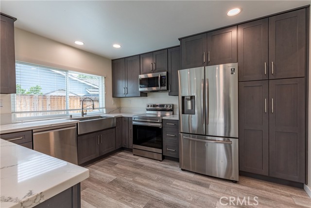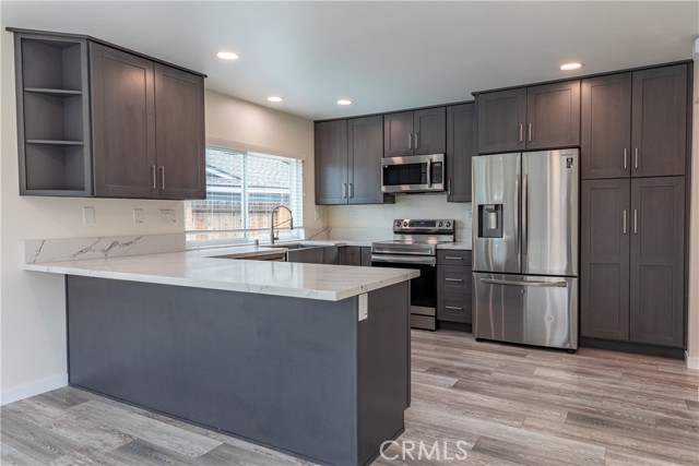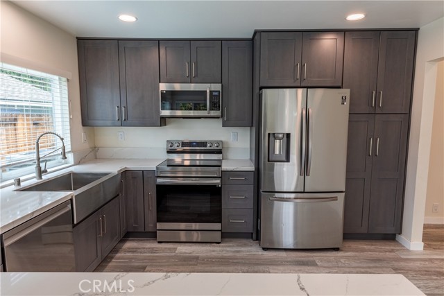 This 4-bedroom, 2-bathroom home sits on a 10,200 square foot lot and offers a functional layout with thoughtful updates throughout. The open living area includes vaulted ceilings and a fireplace, creating a comfortable central gathering space. The custom kitchen features marble countertops, stainless steel appliances (refrigerator included), and an adjacent dining area that opens directly to the backyard. The primary suite includes dual closets and a private bathroom, while the additional bedrooms are spacious and equipped with built-in closet organizers. Recessed lighting, engineered flooring (no carpet), and dual-pane windows enhance the home’s modern feel. Additional features include direct access to the attached two-car garage, central heating and air conditioning system with a Nest thermostat, and solar power. The large backyard provides plenty of outdoor space for entertaining or a new ADU and comes with a storage shed. Conveniently located near schools, parks, and the Richard Nixon Library, this home is within the Placentia-Yorba Linda Unified School District.