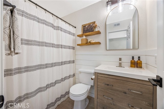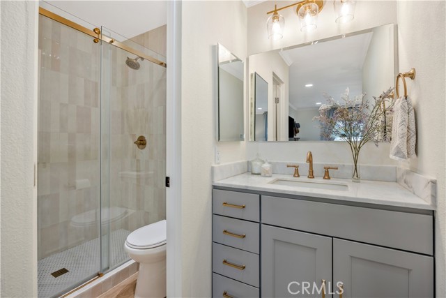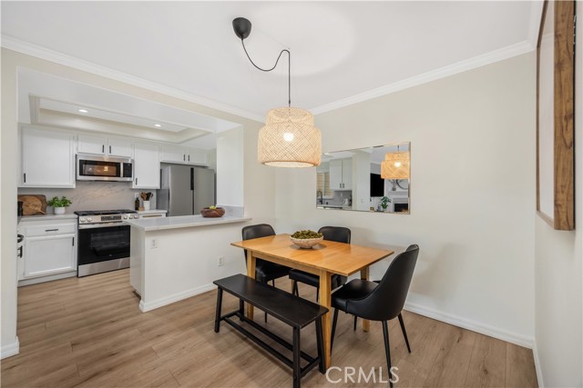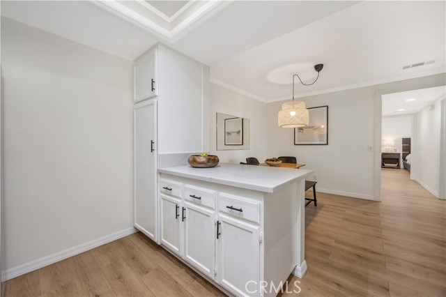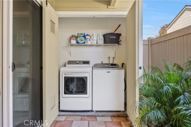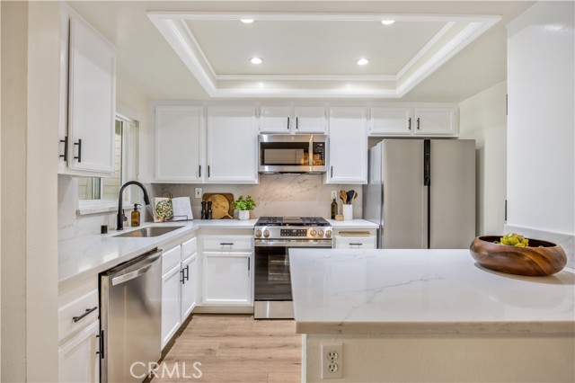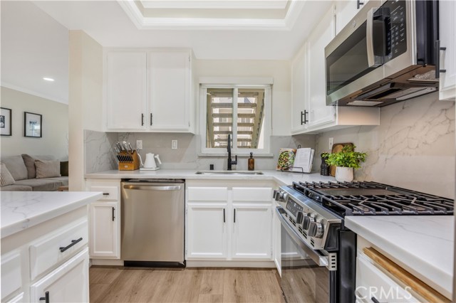 Seller is offering up to $12,000 credit to the buyer, which may be applied toward a 2-1 interest rate buydown or closing costs! Welcome home to 23482 Cambridge Road #294! This beautifully updated 2-bedroom, 2-bathroom ground-level home is located in the highly sought-after community of The Villages in Yorba Linda. Step inside to an open-concept floor plan where the living room features a cozy fireplace with custom wood trim and tile surround. Glass sliding doors lead to a private covered patio with a new full-size washer and dryer, greenery, and a brand-new vinyl fence. The living room flows seamlessly into the dining area, highlighted by a stylish bamboo chandelier. The kitchen is designed for entertaining with a peninsula counter, new quartz countertops and backsplash, all-new stainless steel appliances, and sleek matte black hardware. Down the hall, you’ll find a storage closet and a full bathroom with a soaking tub/shower combo, wood vanity, shiplap accent wall, and floating wood shelving. The generously sized secondary bedroom features a beautifully painted accent wall, while the primary suite offers a private retreat with a newly remodeled bathroom showcasing a marble vanity, walk-in shower with Chloe tile, Delta champagne bronze fixtures, and a walk-in closet with a barn door and custom built-ins. Additional highlights include a detached 2-car garage, freshly painted interior, luxury vinyl plank flooring, recessed lighting, custom window coverings, a newer water heater, and newer AC unit. Residents of The Villages enjoy access to amenities including a pool and spa, playground, volleyball court, and clubhouse. HOA dues also cover water and trash. Conveniently located just minutes from the 91 freeway, shopping, and dining—this home truly has it all!