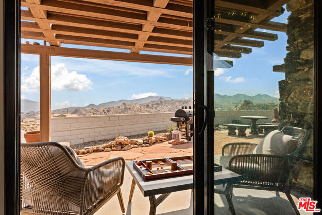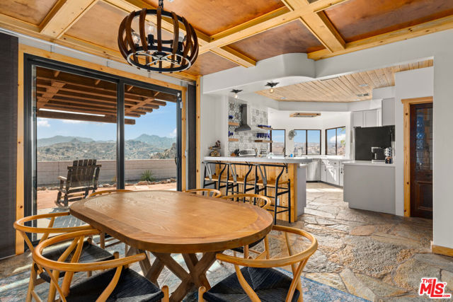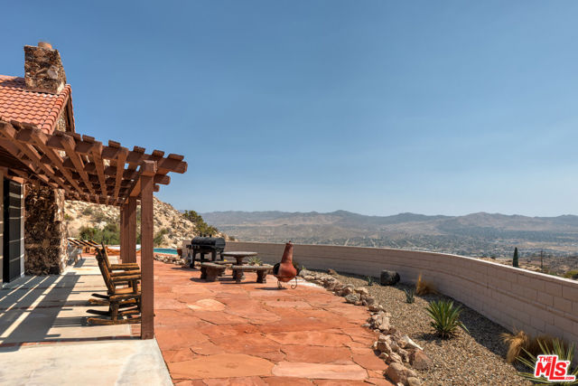 PRICE REDUCED & READY TO SELL! Spectacular 4-Bedroom Desert Estate with Infinity Pool, Panoramic Views & Custom Finishes on 2.5 Acres. Welcome to your private hillside oasisan architecturally distinctive 4-bedroom, 2.5-bathroom home offering approximately 3,400 square feet of beautifully crafted living space, perched on 2.5 acres with unobstructed high-desert and mountain views. This one-of-a-kind property is perfect for those seeking luxury, privacy, and dramatic natural beauty.From the moment you arrive, the gated entry and circular drive set the tone for this custom Spanish-influenced retreat. A tiered fountain anchors the front courtyard, surrounded by low-maintenance desert landscaping and mature native plants. Step through hand-carved double entry doors into a grand living space where vaulted tongue-and-groove ceilings soar overhead and massive picture windows frame jaw-dropping views. A striking stone fireplace serves as the centerpiece of the great room, seamlessly connecting indoor living to the expansive outdoor entertaining areas.Designed for both comfort and entertaining, the open-concept floorplan includes a stunning chef's kitchen with quartz countertops, artisan backsplash tile, custom open shelving, stainless steel appliances, and wraparound corner windows that capture endless desert light. A charming dining nook adorned with three stained-glass arched windows and wood-paneled walls offers an intimate setting for meals with family and friends.The luxurious primary suite features its own private slider to the pool patio, mountain views, and a beautifully designed en-suite bath. Three additional bedrooms provide ample space for guests, a home office, or creative use. Throughout the home, you'll find curated finishes including handcrafted lighting, vintage tile, wood floors, and rustic design details that enhance the home's warm and welcoming character.The resort-style backyard is the crown jewel of the property. An infinity-edge pool and spa appear to spill directly into the horizon, while the flagstone pool deck offers multiple lounge areas, fire pit, and a setting unlike any other. Whether you're hosting sunset gatherings or enjoying serene morning coffee with a view, this space is designed to inspire.Other highlights include a detached bonus structure (perfect for a studio or guest use), ample parking, and proximity to hiking, downtown amenities, and Joshua Tree National Park.