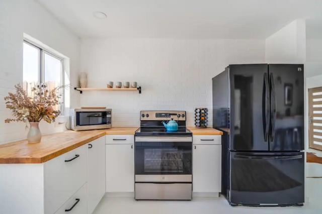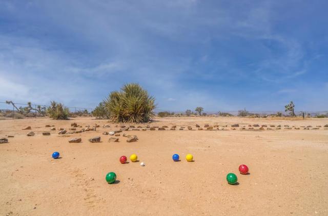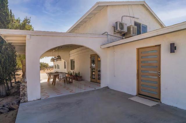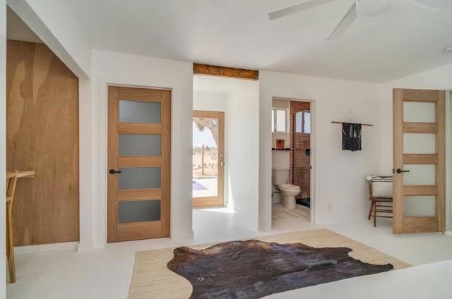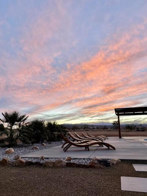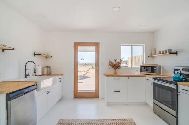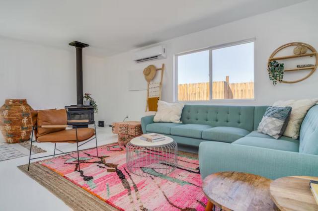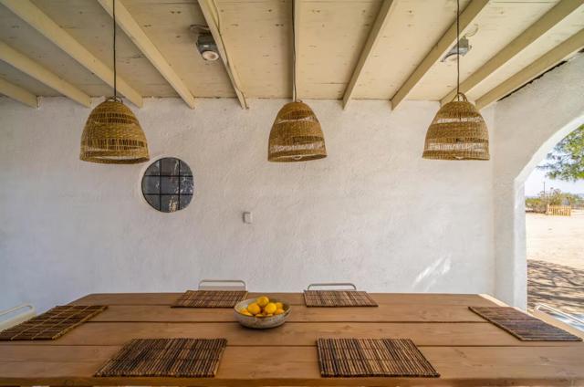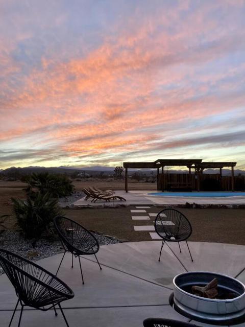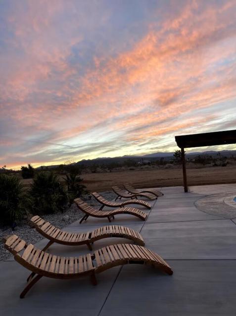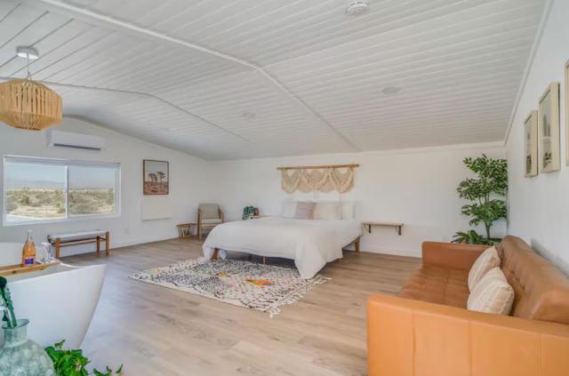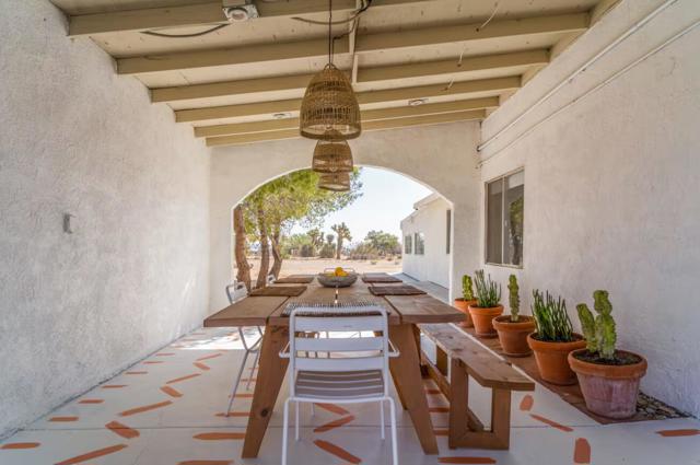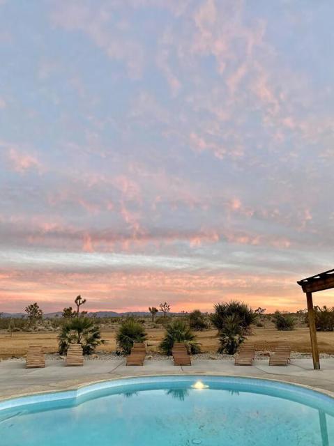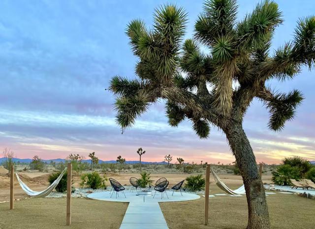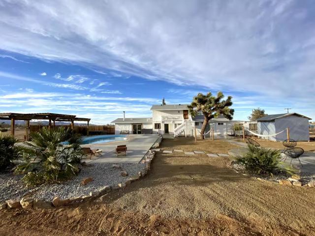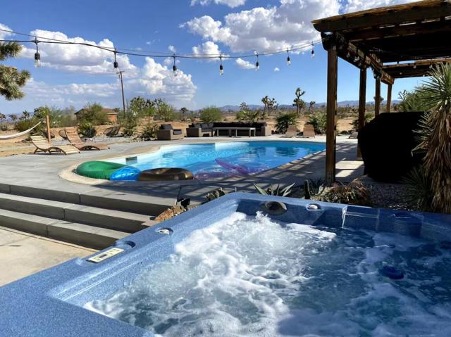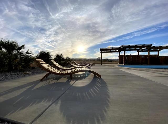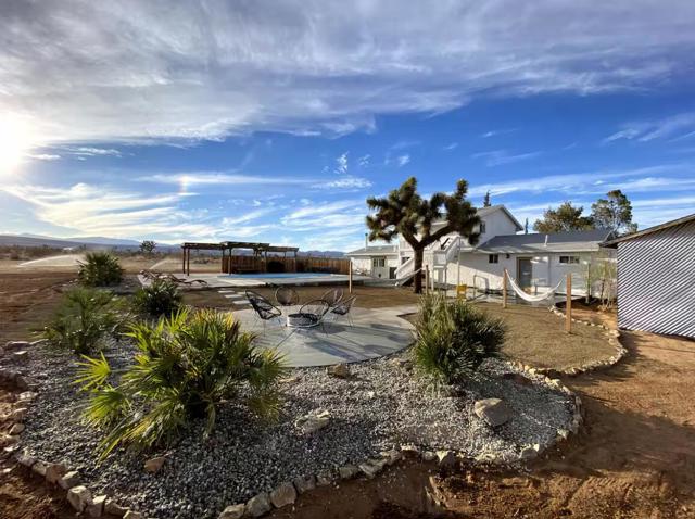 Large designer pool home remodeled from top to bottom. A successful STR for several years. . Situated on 2.5 acres in north Yucca Mesa with panoramic views. Vistas of Mt. San Gorgonio with seasonal snow caps. Views of Goat Mtn, the Big Horn Mtns, and Mt Bartlette surround this oasis set among a sea of beautiful Joshua Trees. 3-bedroom, 3-bath with 1,848 sf & 2 car garage with inground pool & spa. Entryway leads to a covered front patio with woven chandeliers, custom flooring, southwestern cactus arrangement and a long table for dining alfresco. Spacious living room with white smooth walls, ceiling & flooring. Wood Burning stove and mini-split hvac. Kitchen with electric stainless steel appliances, recessed lighting, butcher block counters, breakfast bar, dual basin sink, and ample cupboards and cabinets. Huge second floor master bedroom with laminate floors, arched ceilings, soaking tub, mosaic design wall, uplifting views, doorway to exterior deck and stairs to the patio. Downstairs bedroom with office alcove, door to patio, private bathroom with glass shower and tile. Sprawling concrete patio encircles the inground pool, with pergola, covered BBQ. hammocks, loungers, and separate firepit island. Enjoy starry nights with friends under the milky way. Short trip to all amenities. 16 miles to the Joshua Tree National Monument where about 3 million tourists visit annually. 43 miles to Palm Springs. 131 miles to LA. Don't Wait - Call Now!