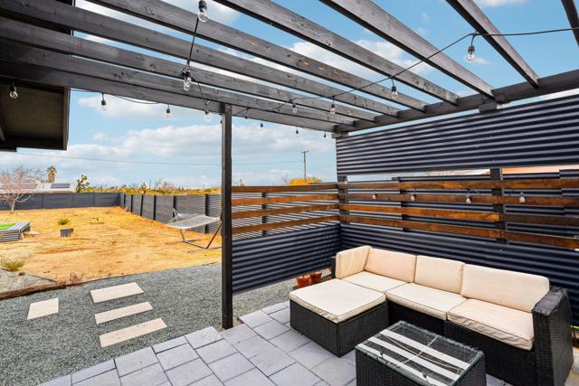 Buyer to Assume Solar Lease. Discover this stunning 2-bedroom, 2-bathroom FURNISHED home set on a sprawling 20,000 sqft lot. Boasting exceptional curb appeal, leased Solar Panels, and a host of modern updates, this residence offers an inviting ambiance. The living room welcomes you with a stylish wood panel feature wall and an electric fireplace. It seamlessly transitions into the dining area, adorned with custom wooden wall designs, as well as the kitchen. The kitchen has been remodeled and features granite countertops, light grey cabinetry, an Included Refrigerator, and a convenient breakfast bar. Just off the kitchen, you'll find a well-appointed laundry room with an Included Washer and Dryer, providing direct garage access. Both bedrooms are generously sized, with the primary suite offering a private bathroom complete with a dual-sink vanity and walk-in shower. A slider leads to a serene side yard, offering a covered pergola, hot tub, and pavers. A second bathroom with a walk-in shower serves guests and the secondary bedroom. The private backyard is an Entertainer's Dream, showcasing a container pool, firepit, covered patio, and majestic Joshua trees. The property also includes 2 Accessory Buildings and ample flat, usable space, ready for your personal design! Located on a paved road and is currently an Active Vacation Rental. This is an unparalleled opportunity to own a truly remarkable home! Schedule your personal tour today!
