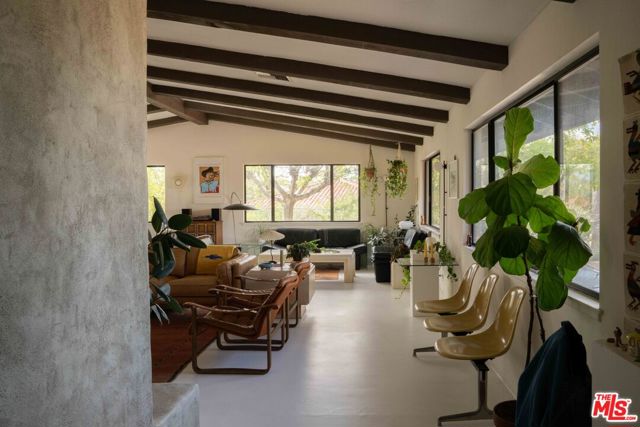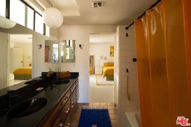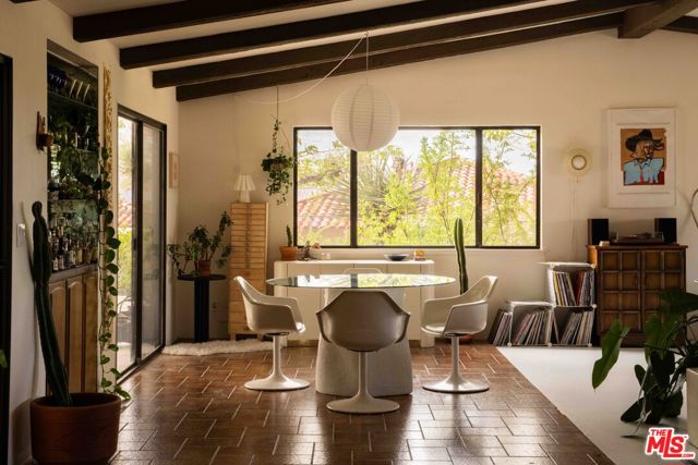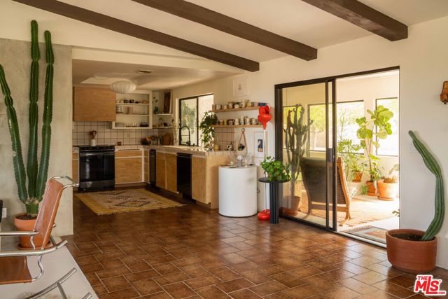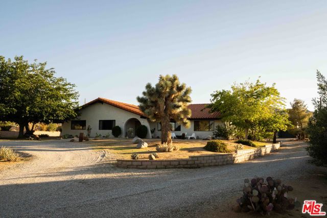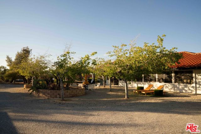 The House on Joshua Lane. South of the highway towards the end of the road you'll find this sweet Spanish villa just outside of Joshua Tree National Park. This 1980's home in upper Sky Harbor still has cool original elements like a dramatic floor-to-ceiling fireplace, sun room that stretches along the length of the home with over 200 square feet of space and a very 80's stone brick wall bathroom. All the while, it's been upgraded in all the right places. Meticulously loved and renovated, the large double front door opens into a proper entry way that splits the living space and the rest of the home. Go left and get swept up by the vaulted ceiling with exposed beams and an expansive living area. The fireplace commands your attention; refinished with a concrete overlay, a built-in bench and fire log display; it becomes the focal point of the room. The living room has been thoughtfully arranged to have multiple spaces. Cozy up around the fireplace or watch movies on the mounted projector, move to the seating area to dive into a good book or listen to a record, or make yourself a drink at the built-in drybar. The kitchen has been refreshed with new cabinet faces, new appliances, and open shelving. The window behind the sink opens to bar seating inside the enclosed sunroom, a fun hosting feature for your friends! The open concept allows for plenty of space for a dedicated dining area or take it outside for alfresco meals under the covered patio. On the other side of the home you'll find two spacious guest bedroom, guest bathrooms, and the expansive primary suite. The primary bedroom is on the south side of the home with sliding glass doors to the enclosed patio, a full bathroom with double sinks plus a large walk-in closet. Find the half bath in the entry hallway with an unforgettable stone brick wall, upgraded lighting fixtures and Moroccan tile. There is an intuitive flow around the home making it the perfect place to host or welcome a full family. The property is fully fenced and situated on the lot for privacy and beautiful sunrise and sunset views. The home is surrounded by mature shade trees that help keep the lot cool plus a new HVAC system. There is an attached two car garage with laundry, tankless water heater and storage as well as a large RV garage toward the back of the 1.4 acre lot. Joshua Lane is perfectly placed for convenient access to everything in Yucca Valley or Joshua Tree while still feeling like the perfect desert retreat. You're just 10 minutes to The Copper Room, Tiny Pony + Desierto Alto, Frontier, The Dez, and so much more.