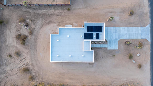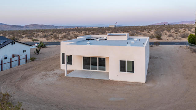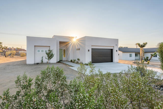 Welcome to 7082 Avalon Avenue - a brand new sanctuary in the heart of Yucca Valley. Thoughtfully designed and freshly completed, this 3-bedroom, 2-bathroom home offers 1,560 square feet of modern living on nearly half an acre, blending style, energy efficiency (paid solar), and open-concept comfort. Built with a quality-over-quantity mindset, this home features 2x6 framing for added insulation, keeping you cooler in summer and warmer in winter - an essential upgrade for comfortable Hi-Desert living. Its east-west orientation perfectly frames stunning sunrises and golden sunsets, enhancing your connection to the desert landscape. From the moment you arrive, the striking White Coconut exterior, accented by a bold black garage door and vibrant green entry details, makes a memorable first impression. A spacious 2-car garage provides secure parking and storage, while wide side yards offer plenty of room for RV parking, trailers, or toys - perfect for desert adventurers. Inside, the open floor plan welcomes you with natural light pouring through 6-foot tall living room windows and a 12-foot sliding glass door that leads to the backyard - ensuring you enjoy beautiful views from the inside out. The kitchen is a showstopper, featuring quartz countertops, crisp white tile backsplash, a spacious center island with bar seating, and a full suite of brand new Samsung stainless steel appliances. A large walk-in pantry and a dedicated laundry room with washer, dryer, folding counter, and built-in cabinetry add convenience and function. Tucked privately at the back of the home, the primary suite offers backyard access, a walk-in closet, and a spa-inspired bath with dual vanities and a sleek, glass-enclosed shower. Two additional bedrooms and a full guest bath are located near the front of the home, offering ideal separation and flexibility. The blank-slate backyard is ready to become your dream outdoor oasis. Enjoy vibrant desert sunsets from the covered patio, surrounded by panoramic views and wide-open skies. Located just minutes from Walmart, Home Depot, and Stater Bros, with easy access to Joshua Tree National Park and Palm Springs. Come see this modern desert gem today!