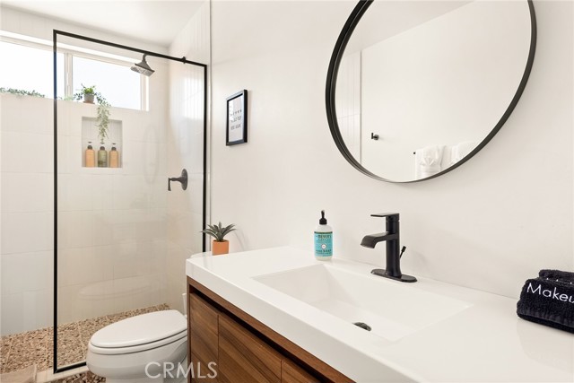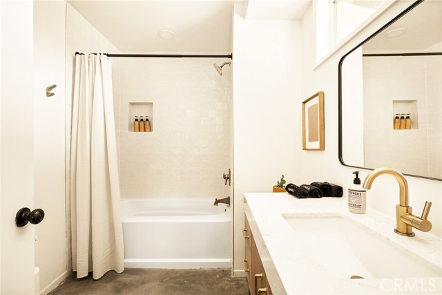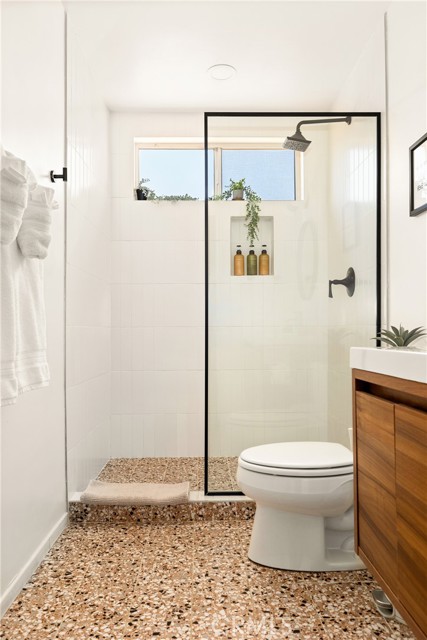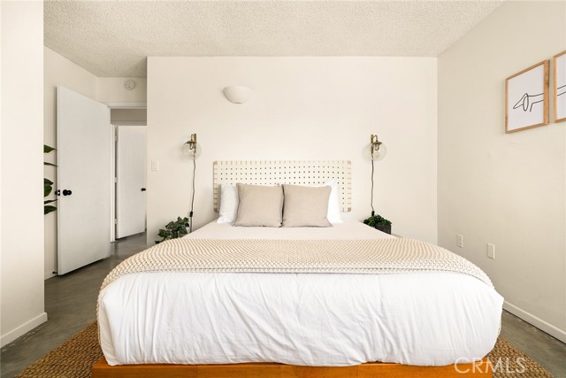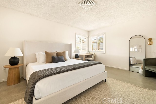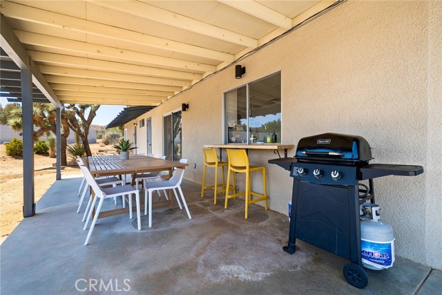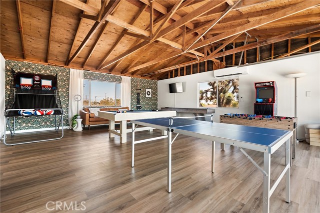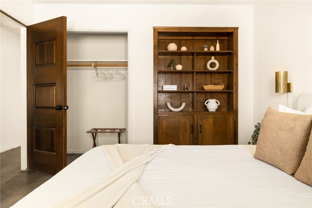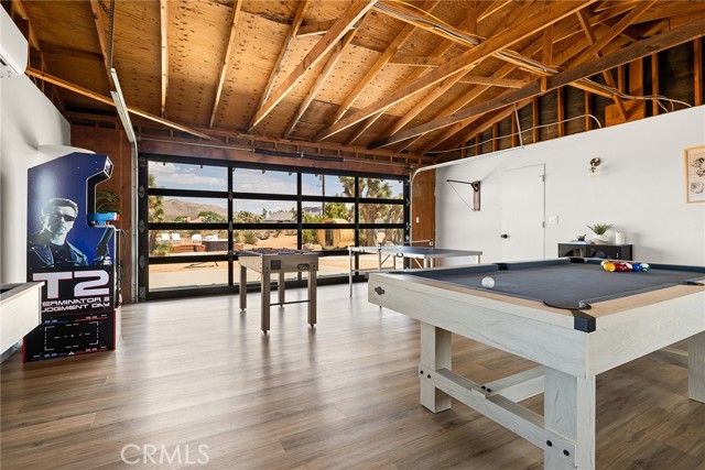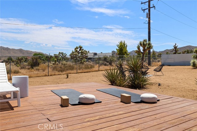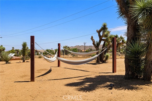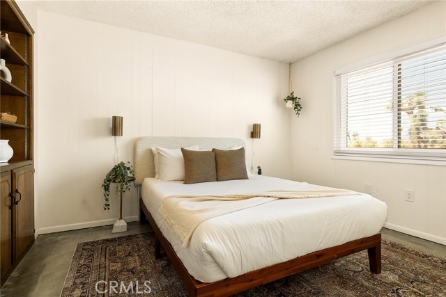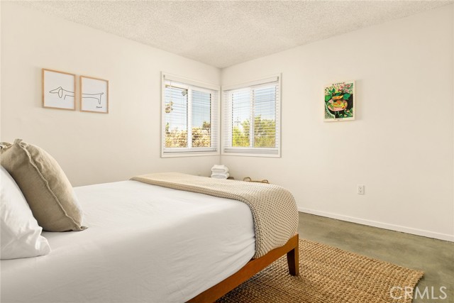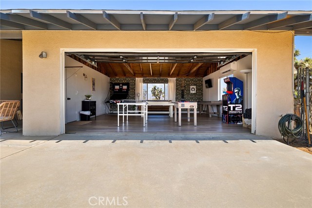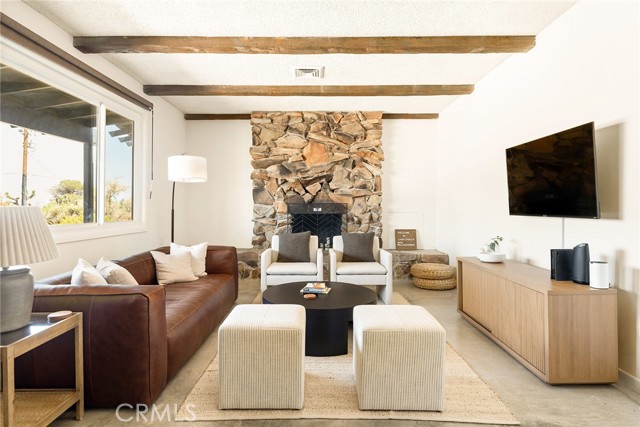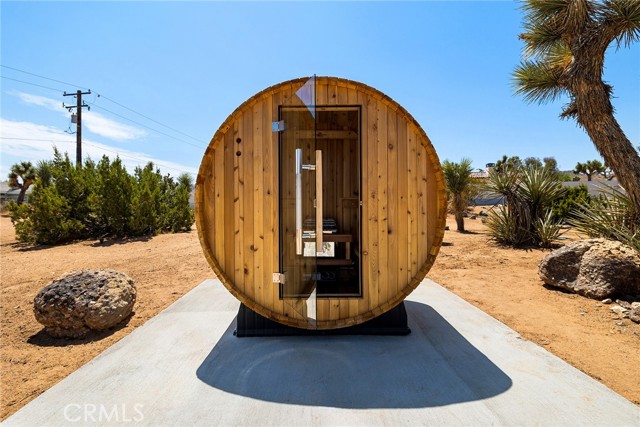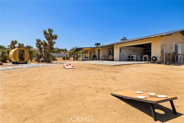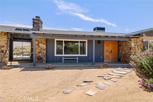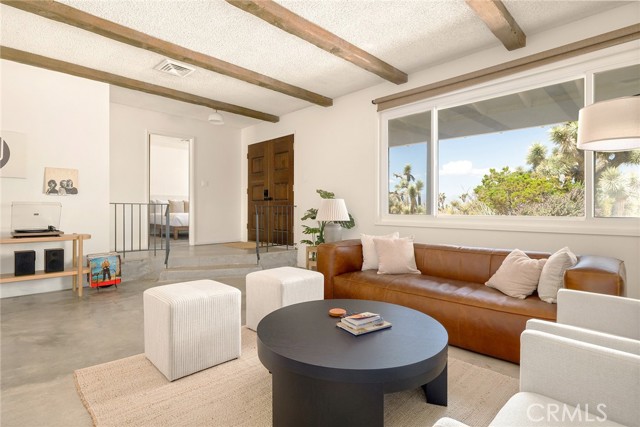 Classic Midcentury Charm, Floor plan and Architecture with sunken living room. Midcentury charm starts with curb appeal, this home is set back from the street, centered on a square 1.4 acre lot. A long-looped driveway through lush hi-desert plants and bushes including large Joshua Trees and a large rear facing garage, a classic feature of Yucca Valley homes because of their large lots and relaxing lifestyle, most commonly built by early developer Fred A. Storey. The face of the home features rock masonry, exposed beams and eaves, a welcoming front patio and breezeway. The entry features double doors, paneled and carved. The entry looks on to a sunken living room, a giant window with beamed ceilings and a grand rock fireplace. The home has polished concrete floors throughout. To the right a den/office/bedroom with an ornate door. Forward through a pocket door is an open concept kitchen, dining room and laundry room with doors to the yard and breezeway. The bedroom wing hall has a large bank of built cabinets for extra storage. The guest bathroom is large and remodeled with terrazzo tile floors, floating vanity and a walk-in shower. The guest bedroom is large, with a large closet and windows. The primary bedroom is very large, with a walk-in closet, and remodeled full bath. The yard is big, the amenities spaced out with large Joshua Trees and pathways and wide views of Joshua Tree National Park Mountains. The large rear facing garage with its huge glass door and finished game room interior and mini split for heating and cool it’s the perfect place to enjoy the view and preside over a gathering enjoying the pool, spa, sauna and sundeck.
