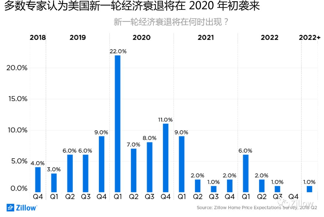 Zillow 最新一期问卷调查中,近半数的专家预测,美国将在 2020 年左右出现新一轮的经济衰退。