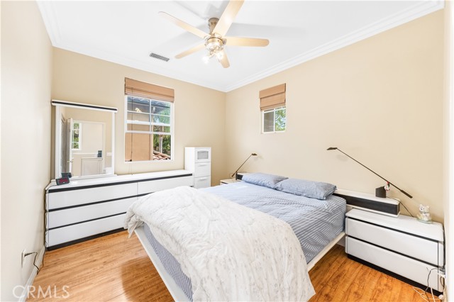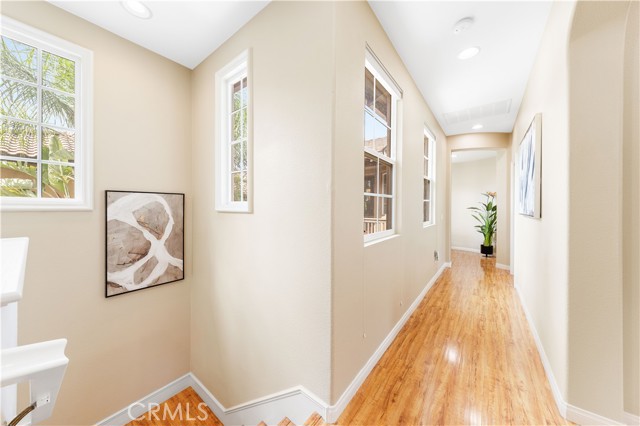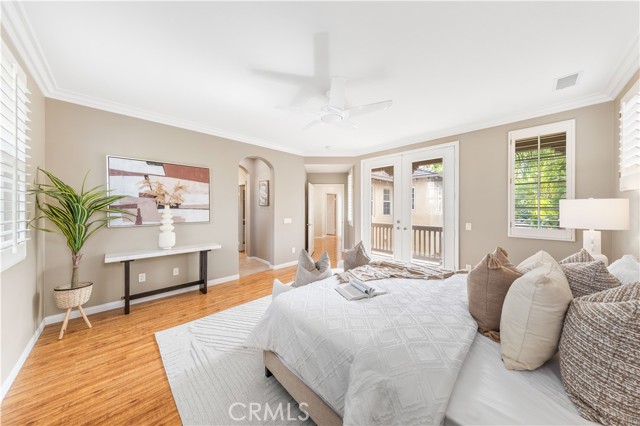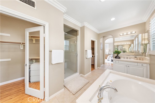The true highlight is the expansive private backyard—rare in Irvine—with mature palms, lush landscaping, stone pavers, and a hot tub, perfect for entertaining or relaxing in total privacy. Upstairs, the primary suite offers a private balcony and a spa-inspired bathroom with dual vanities, soaking tub, separate shower, and two walk-in closets.